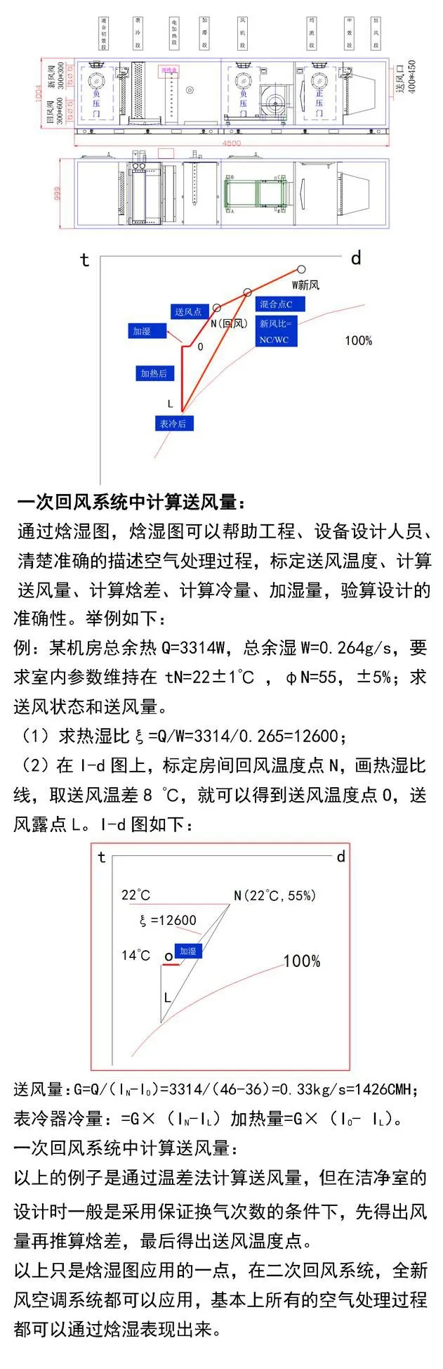 下圖為濕空氣焓濕圖(部分)的示意圖(圖片來源百度百科)   該圖是以1kg干空氣的濕空氣為基準繪制的。不同大氣壓的焓濕圖是不同的。焓濕圖上有幾種等值參數線:等焓(h)線—與縱坐標成135°角的直線;等含濕量(d)線—平行縱坐標軸的直線;等干球溫度(t)線—近似水平的直線;等相對濕度(Ø)線—圖中的曲線;等濕球溫度線近似與等焓線平行,圖中未表示;水蒸氣分壓力(pw)與d成單值函數關系,其值表示于d的上方,等pw線平行于等d線;圖的右下方給出了熱濕比ε的方向線,熱濕比又稱角系數。