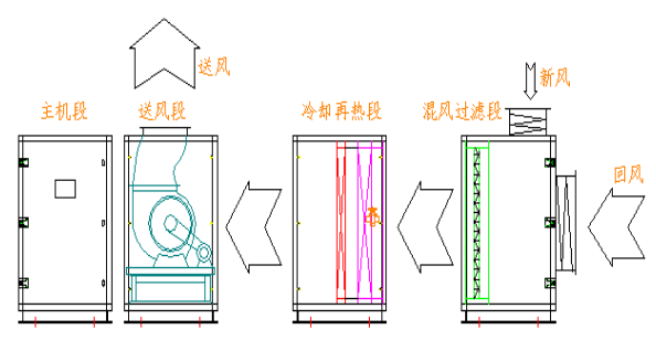 地下工程用除濕空調(diào)機(jī)采用模塊化設(shè)計(jì)理念和組合式結(jié)構(gòu),由混風(fēng)過濾段、冷卻再熱段、送風(fēng)段和主機(jī)段組合而成。自由拼裝,連接簡單,拆卸方便。
